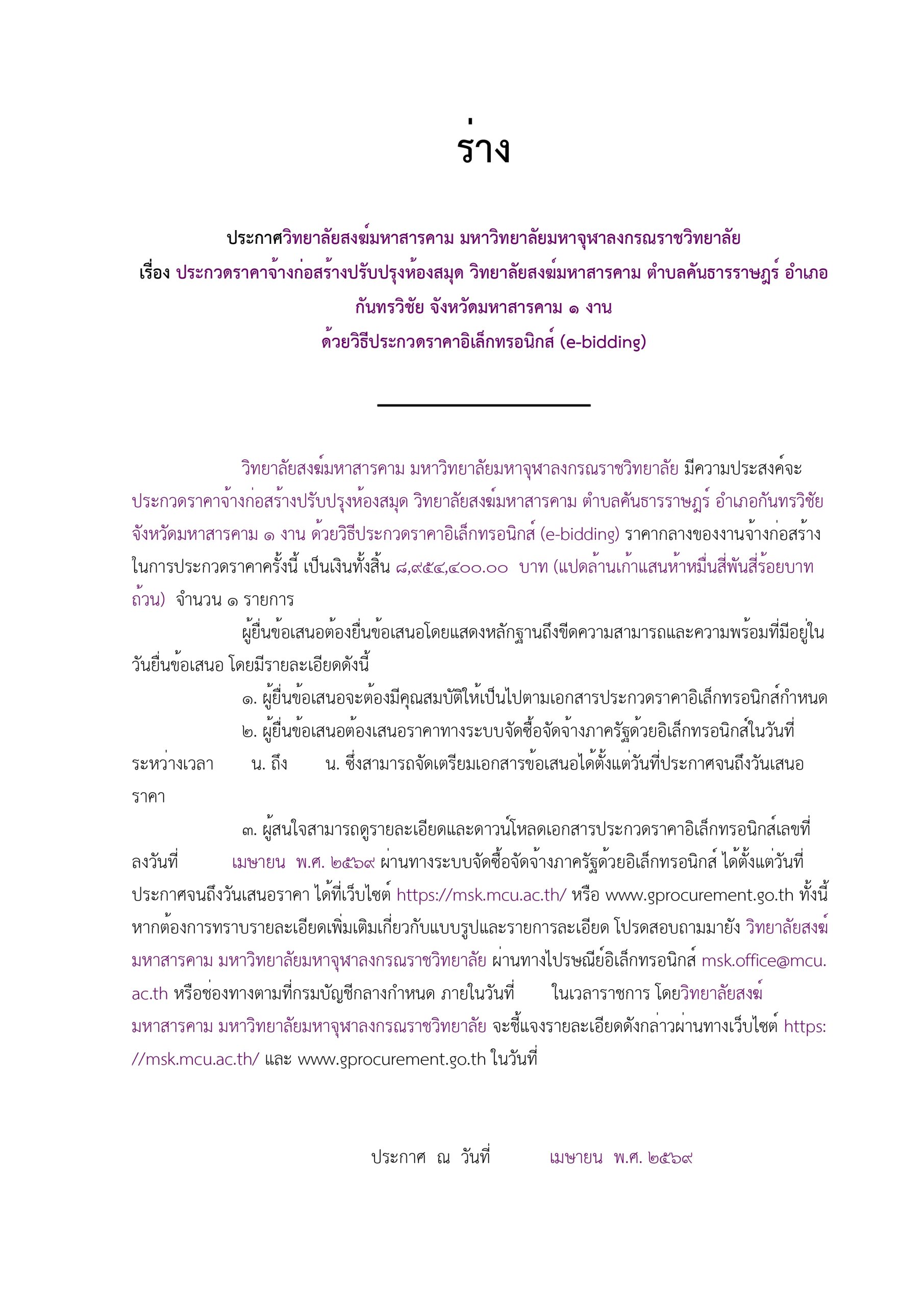 เอกสารประกวดราคาจ้างก่อสร้างด้วยวิธีประกวดราคาอิเล็กทรอนิกส์ (e-bidding) การจ้างก่อสร้างปรับปรุงห้องสมุด วิทยาลัยสงฆ์มหาสารคาม ตำบลคันธารราษฎร์ อำเภอกันทรวิชัย จังหวัดมหาสารคาม ๑ งาน คลิกเพื่อดูเอกสาร>>